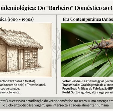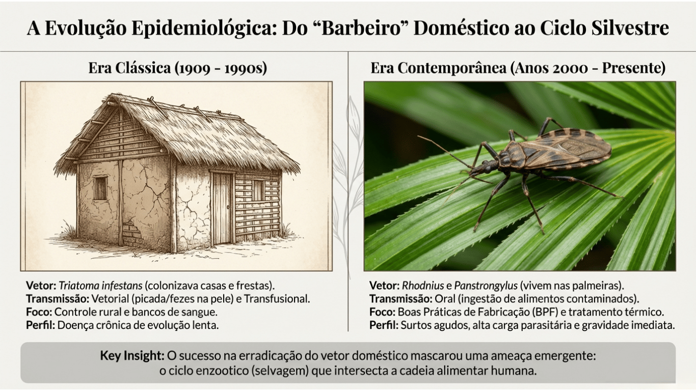 Durante décadas, o combate à Doença de Chagas no Brasil focou no Triatoma infestans, um vetor não nativo que colonizava frestas em casas de pau-a-pique. Com o controle desse vetor doméstico, surgiu um novo cenário epidemiológico na Amazônia. O risco migrou do campo para a tigela urbana através da contaminação oral, ocorrendo quando o inseto ou suas fezes são acidentalmente processados junto com os frutos.