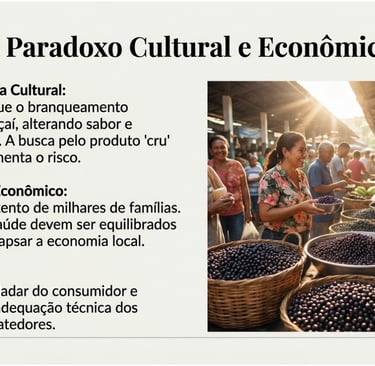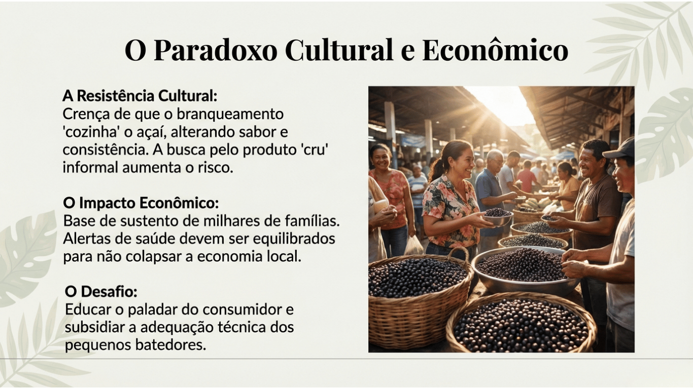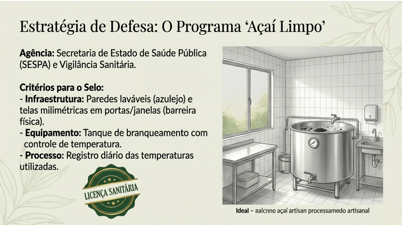 Em 28 de janeiro de 2026, o Governo do Pará instalou formalmente um comitê para modernizar e fiscalizar a cadeia produtiva, fortalecendo o programa "Açaí Limpo". O objetivo é transformar batedores artesanais em unidades de processamento seguras, combatendo a barreira cultural de que o branqueamento "cozinha" o açaí — um mito que ainda leva consumidores a buscarem produtos informais e perigosos.