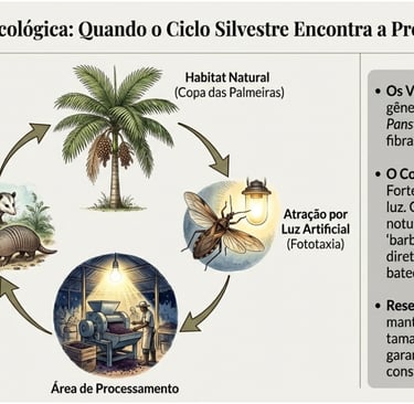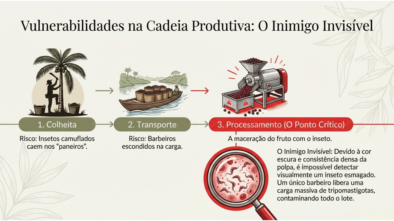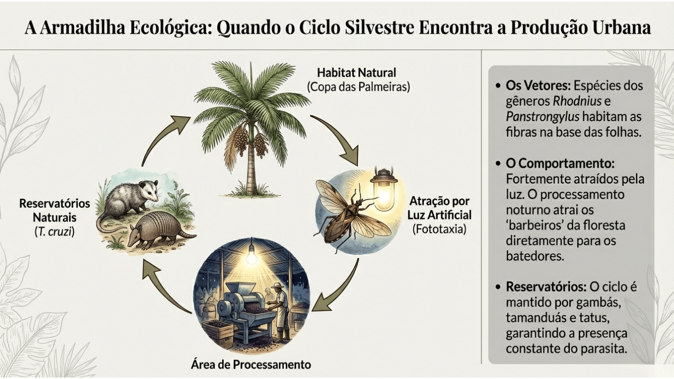 Aqui encontramos uma amarga ironia técnica: para manter o frescor do fruto e evitar o calor intenso do dia amazônico, muitos batedores artesanais processam o açaí durante a noite ou madrugada. A iluminação artificial necessária para esse trabalho é justamente o que atrai esses insetos fototáticos da floresta diretamente para as unidades de processamento. Uma vez nos cestos (paneiros), um único triatomíneo esmagado pelo batedor pode liberar uma quantidade de protozoários Trypanosoma cruzi significativamente superior àquela transferida por uma simples picada, tornando a polpa contaminada uma via de infecção altamente potente.