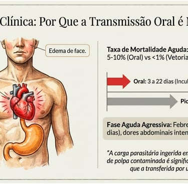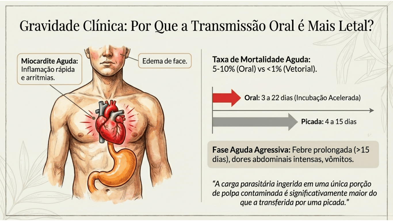 Devido à altíssima carga parasitária ingerida, o período de incubação é reduzido (3 a 22 dias) e a fase aguda é agressiva. Os pacientes apresentam febre alta e prolongada (mais de 15 dias), dores abdominais intensas e, em muitos casos, miocardite precoce (inflamação do coração) e insuficiência cardíaca. A taxa de mortalidade na fase aguda da transmissão oral atinge entre 5% e 10%, o que exige um diagnóstico rápido, especialmente durante a safra no Pará (agosto a dezembro).