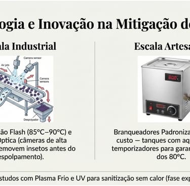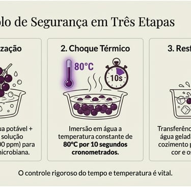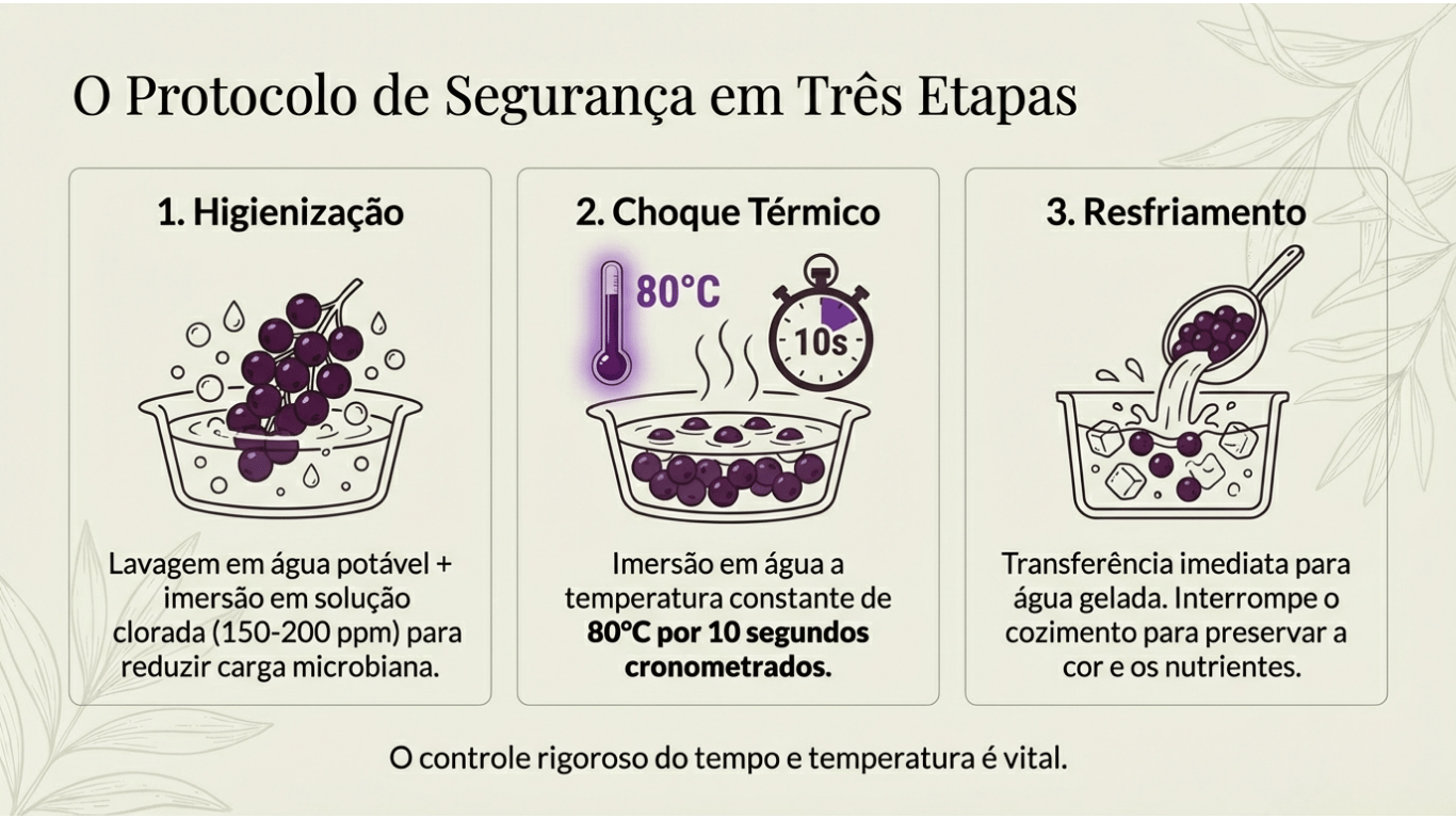 A principal defesa científica contra o parasita é o processo de branqueamento. Não se trata apenas de "lavar" o fruto, mas de uma intervenção termodinâmica precisa. O protocolo exige três etapas: limpeza em água potável, choque térmico e resfriamento imediato.